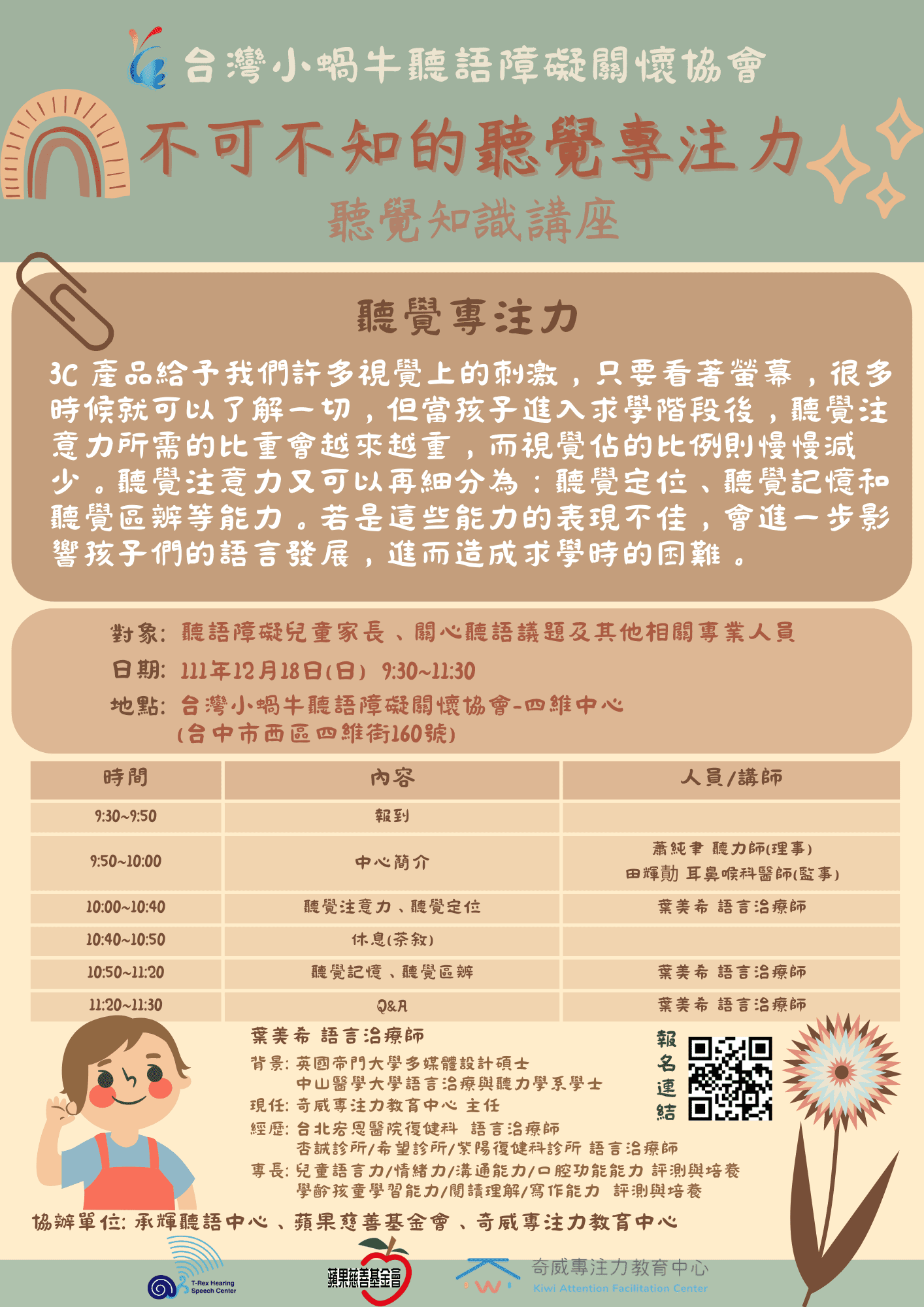 ♦主辦單位:台灣小蝸牛聽語障礙關懷協會
